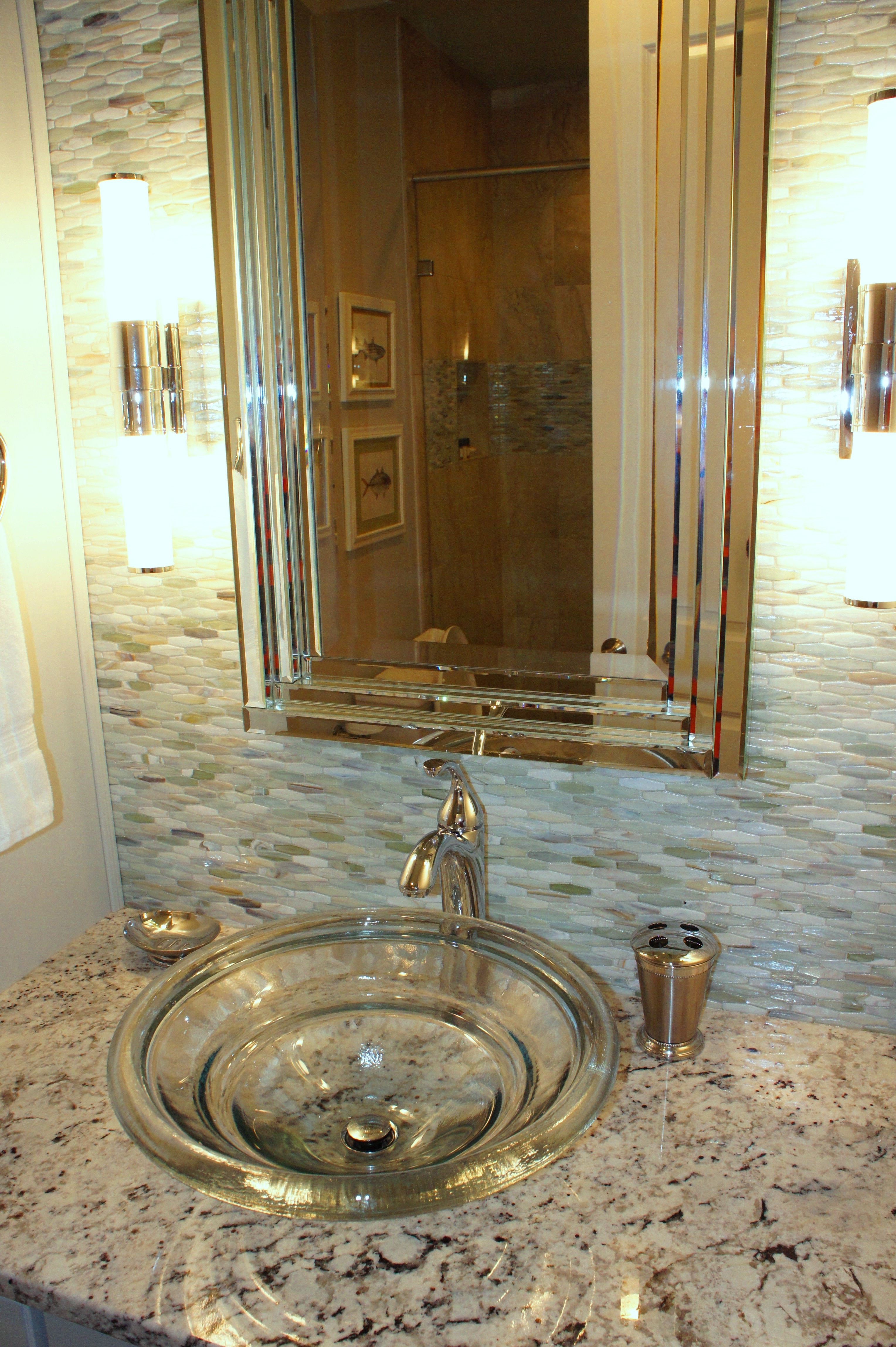 On the outlying counters, we used a less conspicuous, but equally cool solid surface material that contained pieces of shell, beach glass, and tiny reflective mirror pieces. Finally, the backsplash needed some sparkle, which was achieved with this horizontal staggered glass tile.