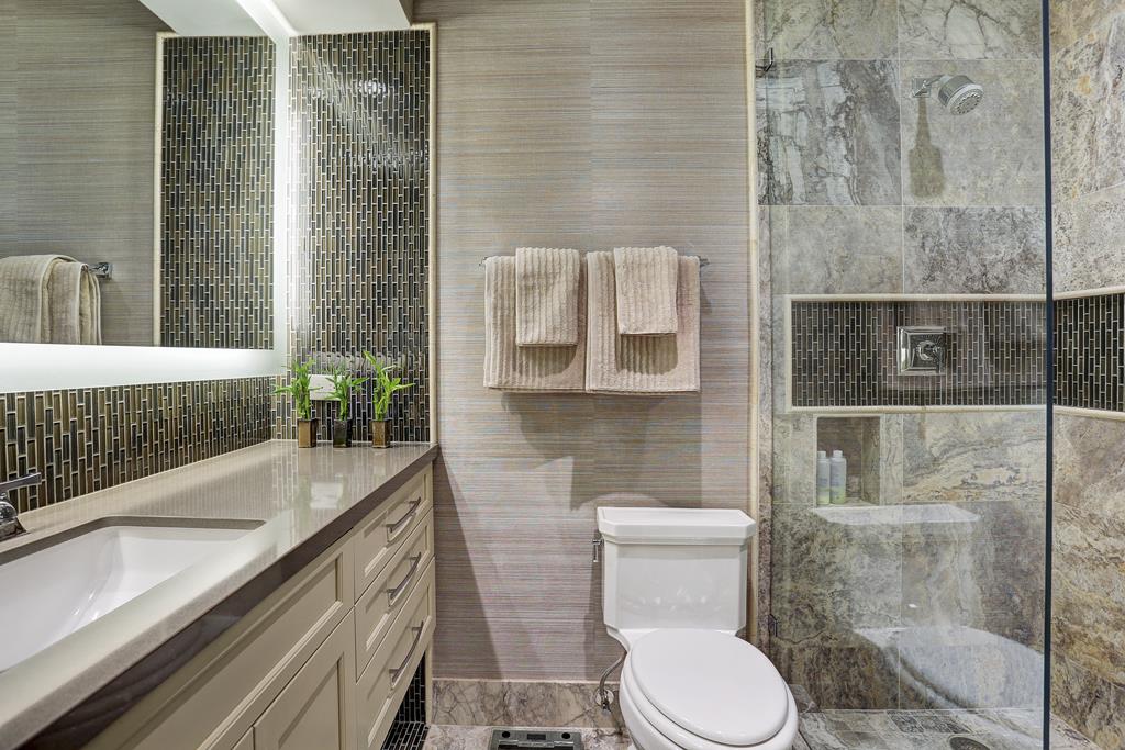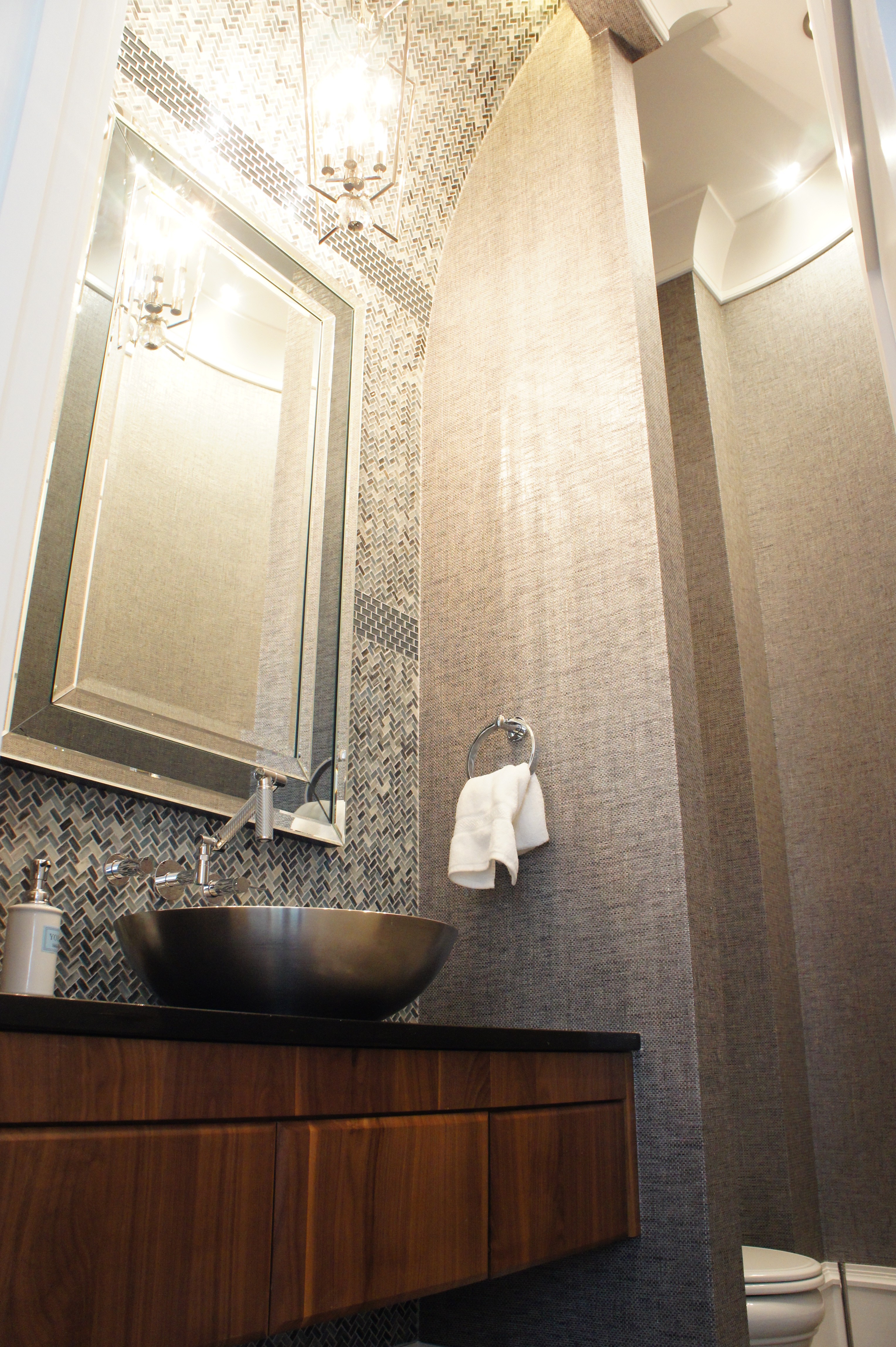 The Powder Bathroom in this unit was the perfect area to be dramatic with our wall application. I chose this glitzy champagne, black and cream Romo wallcovering for its drama and flirtiness. The silver wall sculptures by Arteriors were the perfect way to add art, without taking away from the pattern in the wallpaper. The circles in the sculptures work with the round “pods” in the wallpaper pattern.