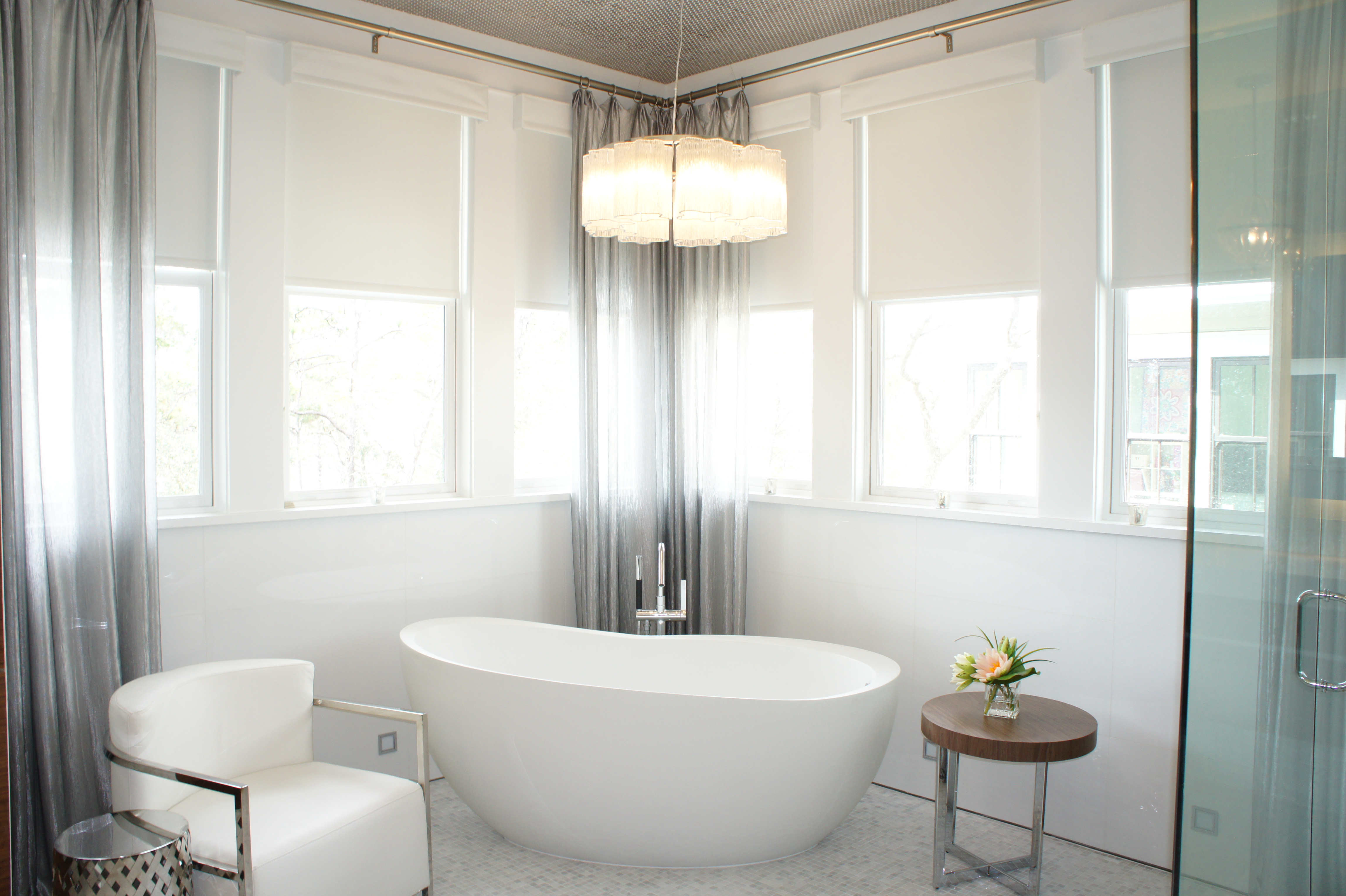 In the Dining Room, I chose a round table to mimic the curve of the windows. You will see I used curvilinear lines throughout. They help move the eye around the room, and it allows the architecture and the furniture to “have a conversation”, if you will. It’s also a way of softening a contemporary look.
