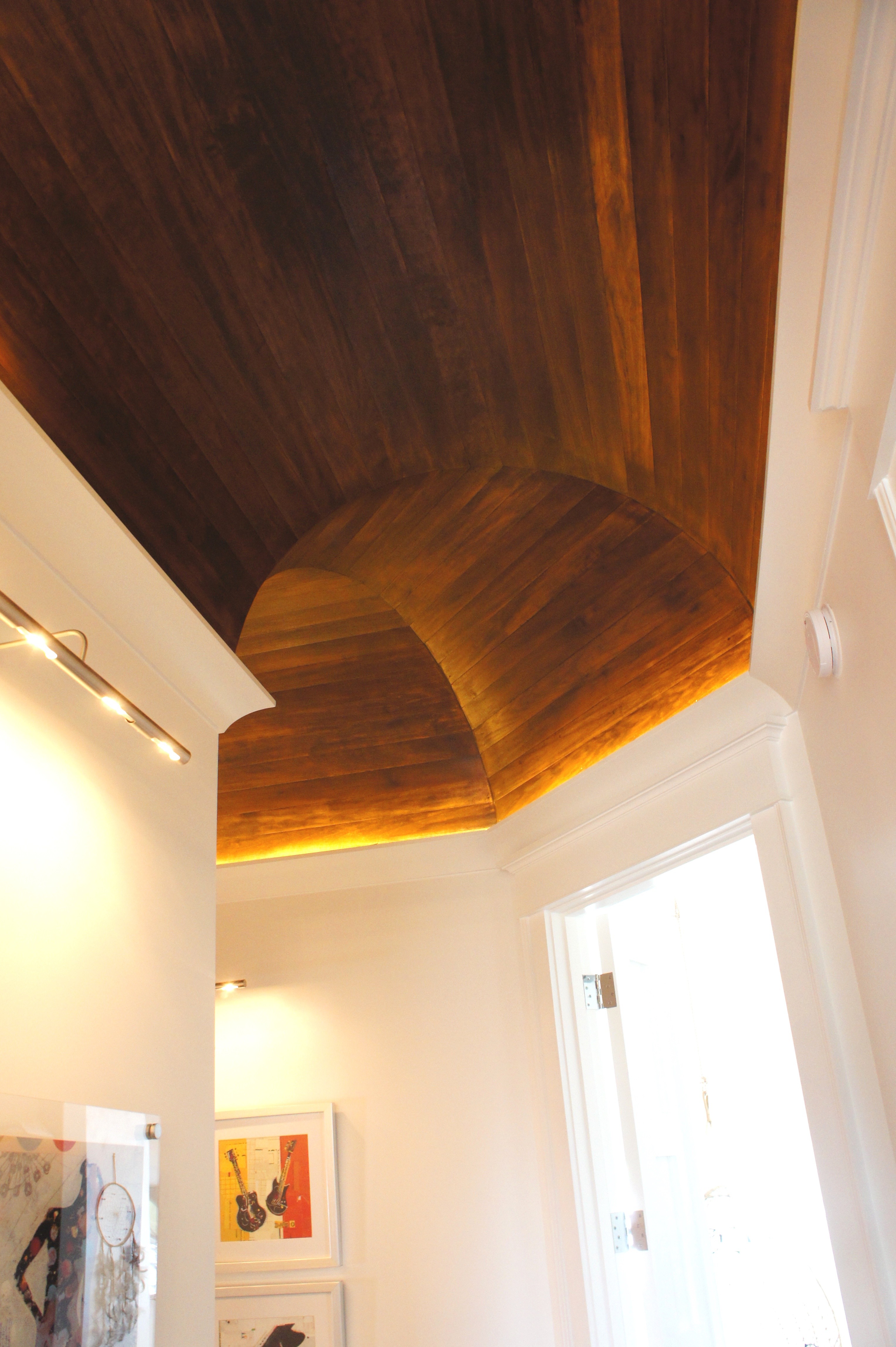I commissioned local artist, Mary Hong, to paint these 8′ tall acrylic and glass abstract panels! (In above picture, to the left). You can see a hint of the track-and-pendant system I installed in the part of the lobby that overlooks the pool level.