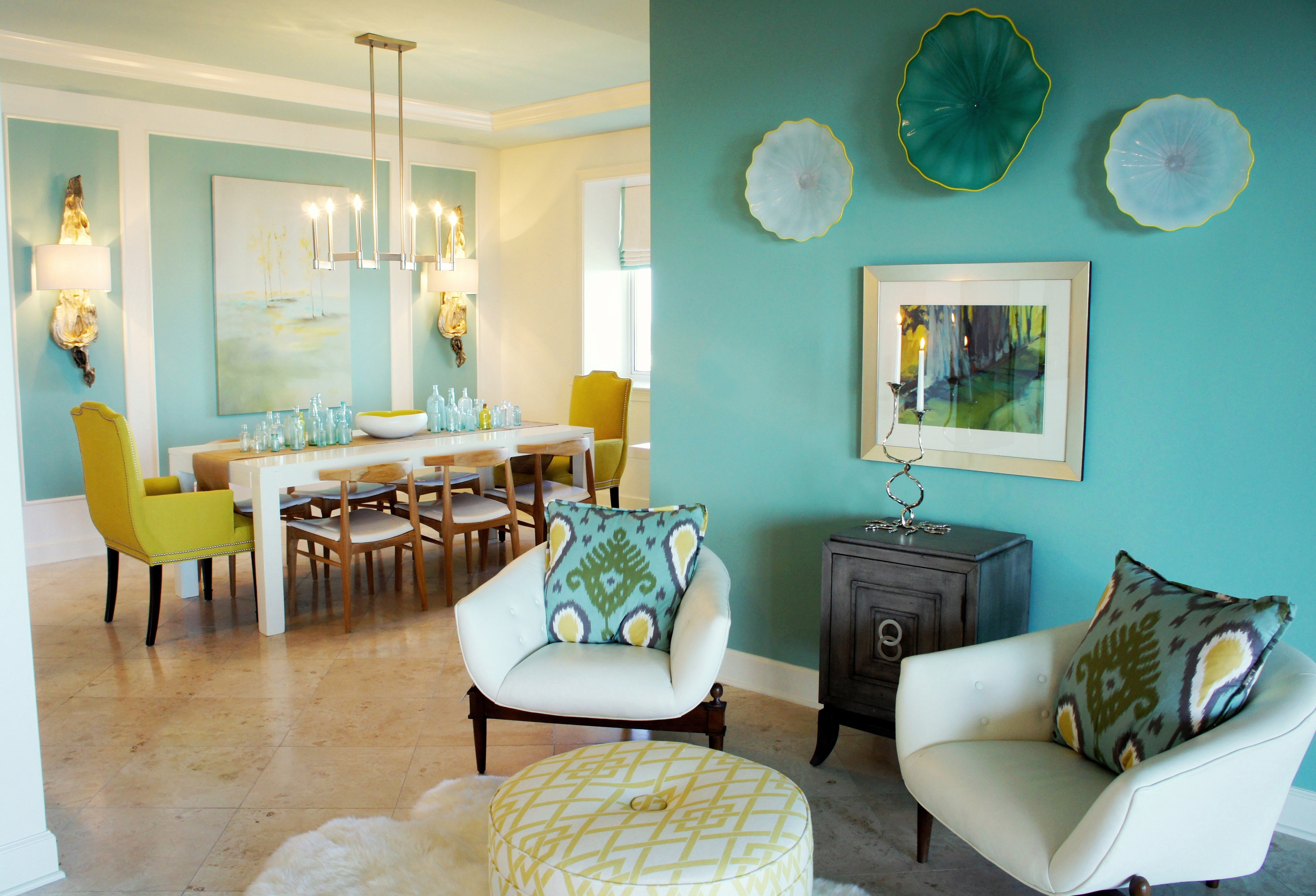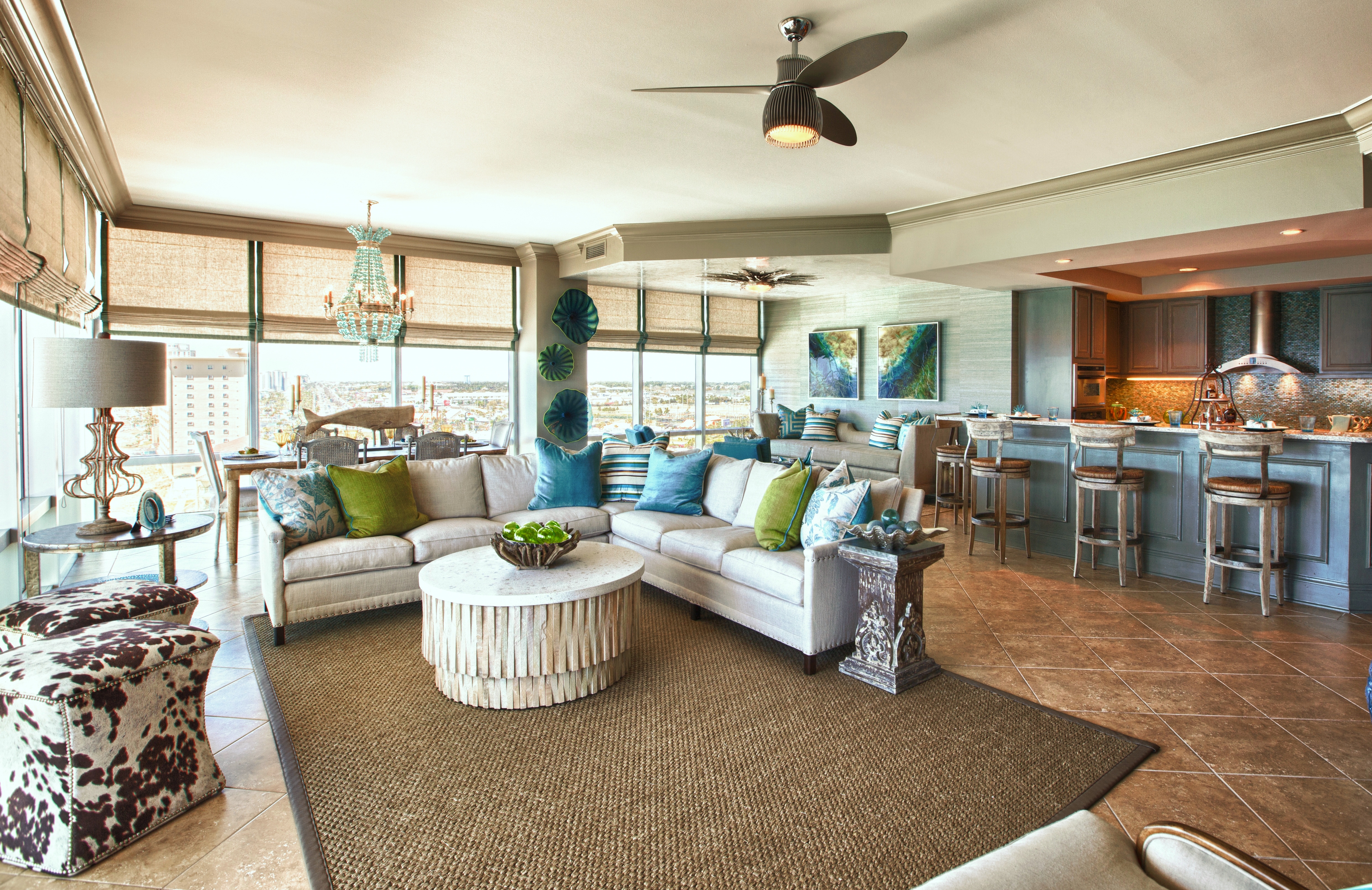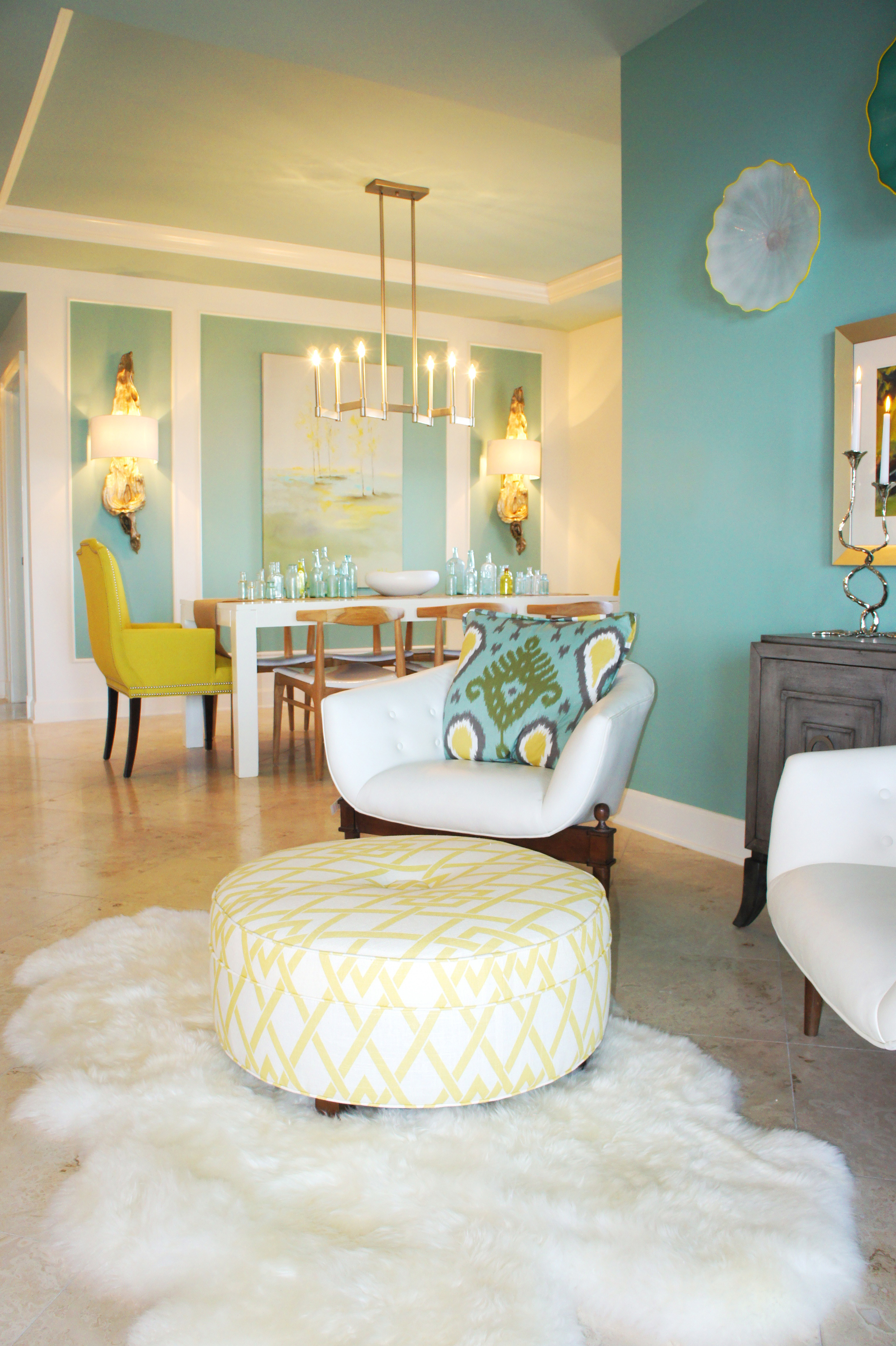 Living Room: This room is very chic, with its clean-lined sectional with bench cushions, and fur accent chairs! Pillows are always a prime opportunity to bring color into a room, in an easy, non-committal way. Two-sided pillows are always fun! You can change your pillows from a seafan print to solid quiet teal, just by flipping them around!