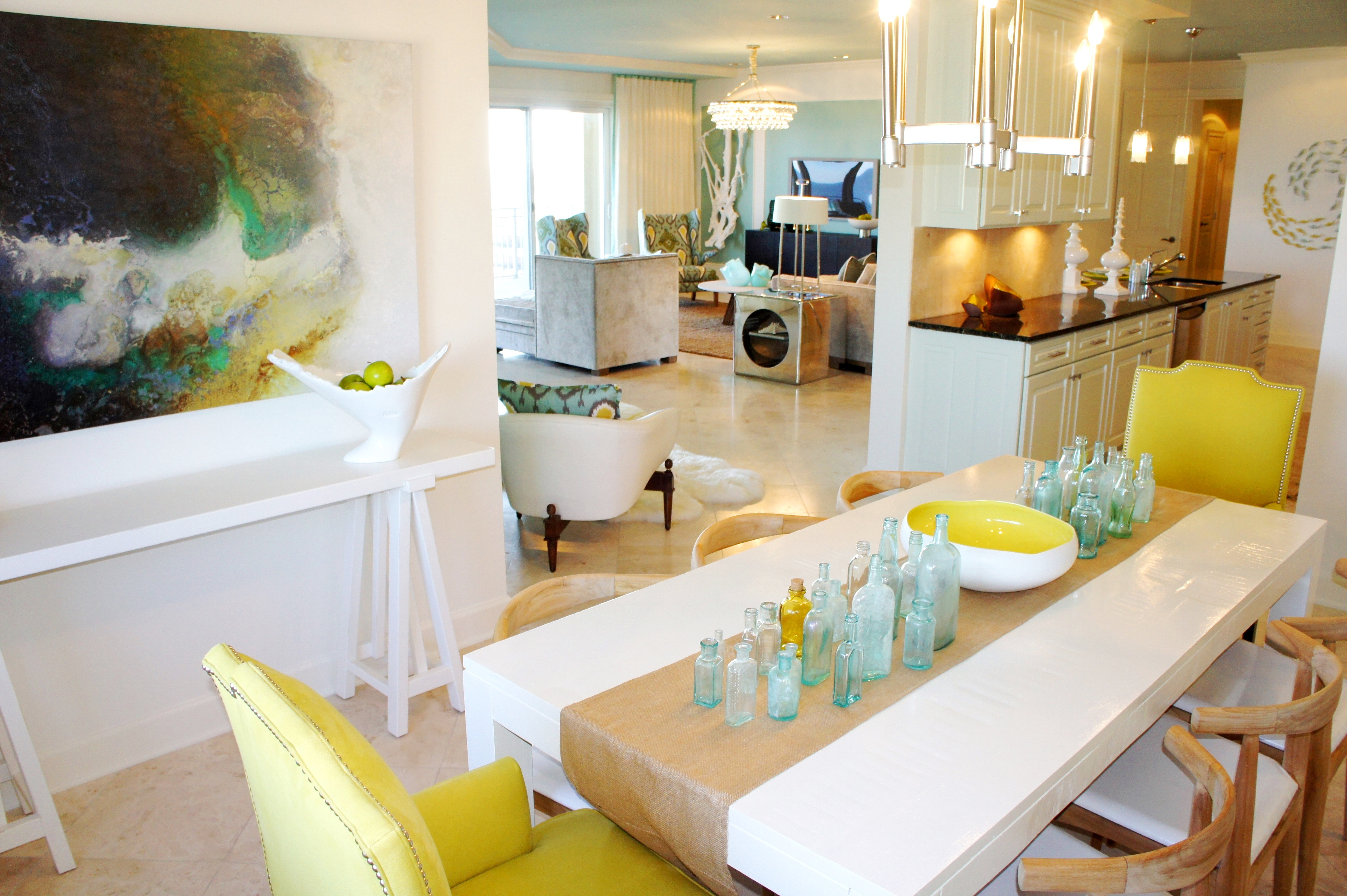 When I was asked to furnish and design two model condominium units at Grand Dunes, I decided it was time I give yellow a chance to shine! Yellow and Gray (warm gray in this case) look so sophisticated together, and when bright splashes of turquoise and blues are thrown into the mix, the design takes on a more youthful, coastal flair. The deeper amber hues give a touch of richness reminiscent of dusk.