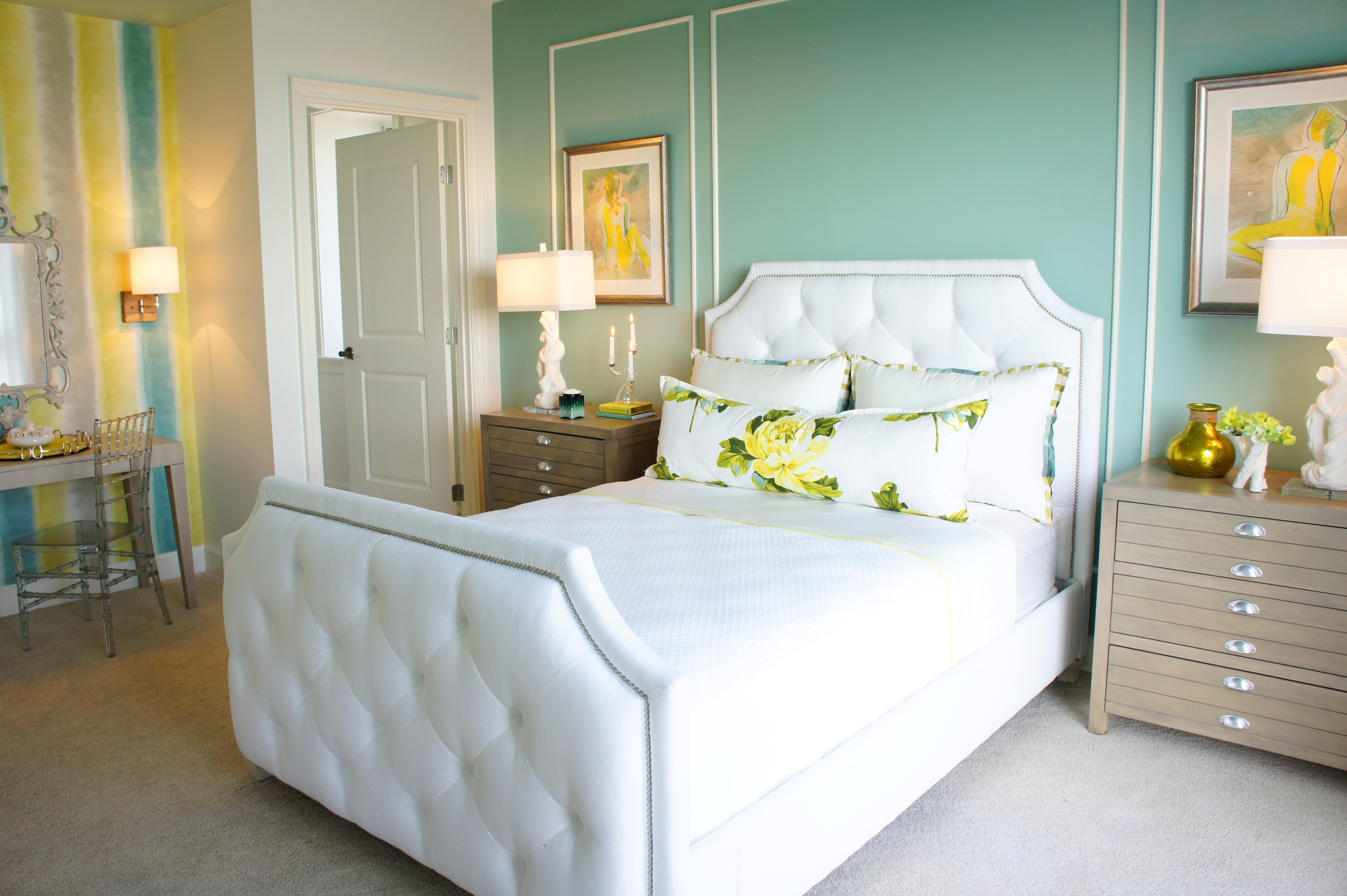 The Master bedroom turned out beautiful. I chose a high, plush velvet upholstered headboard, some fun artwork, and a rich, soft rug to anchor it all! I love painting a room with color!