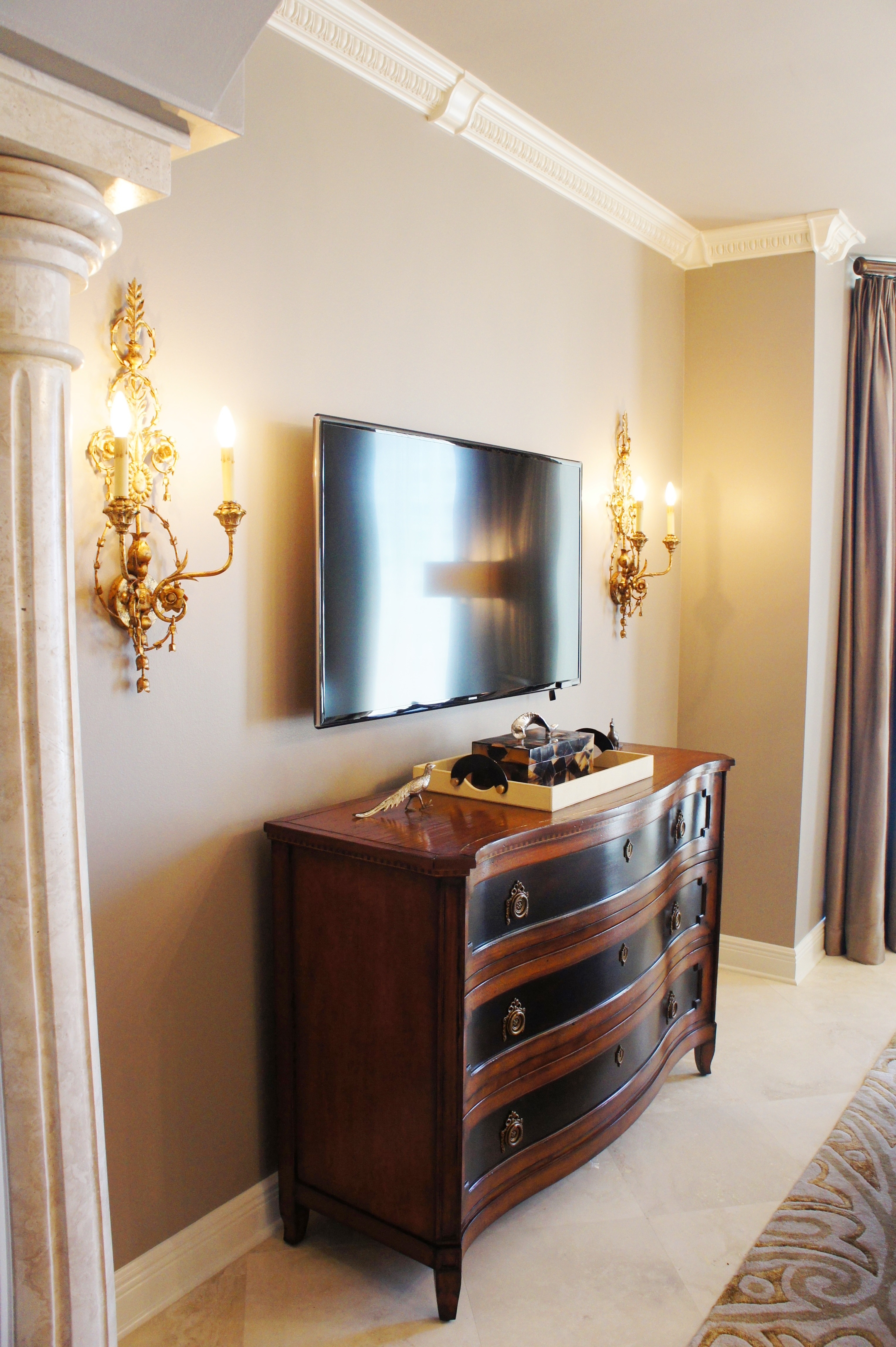 This may be my favorite Master Bedroom design, to date! I wish this were MY room! We replaced the patterned carpet with hand-scraped wide plank wood. I chose the most beautiful creamy paint color for the walls to brighten things up! All of the walls had a faux plaster finish in a goldish tan undertone–I wanted to KEEP the texture, but amp up the lightness so that the wood floors and other wood pieces would have some contrast! So, the paint has a pearlescent finish that’s very subtle, but emphasizes the texture, and is so much richer than flat or satin.