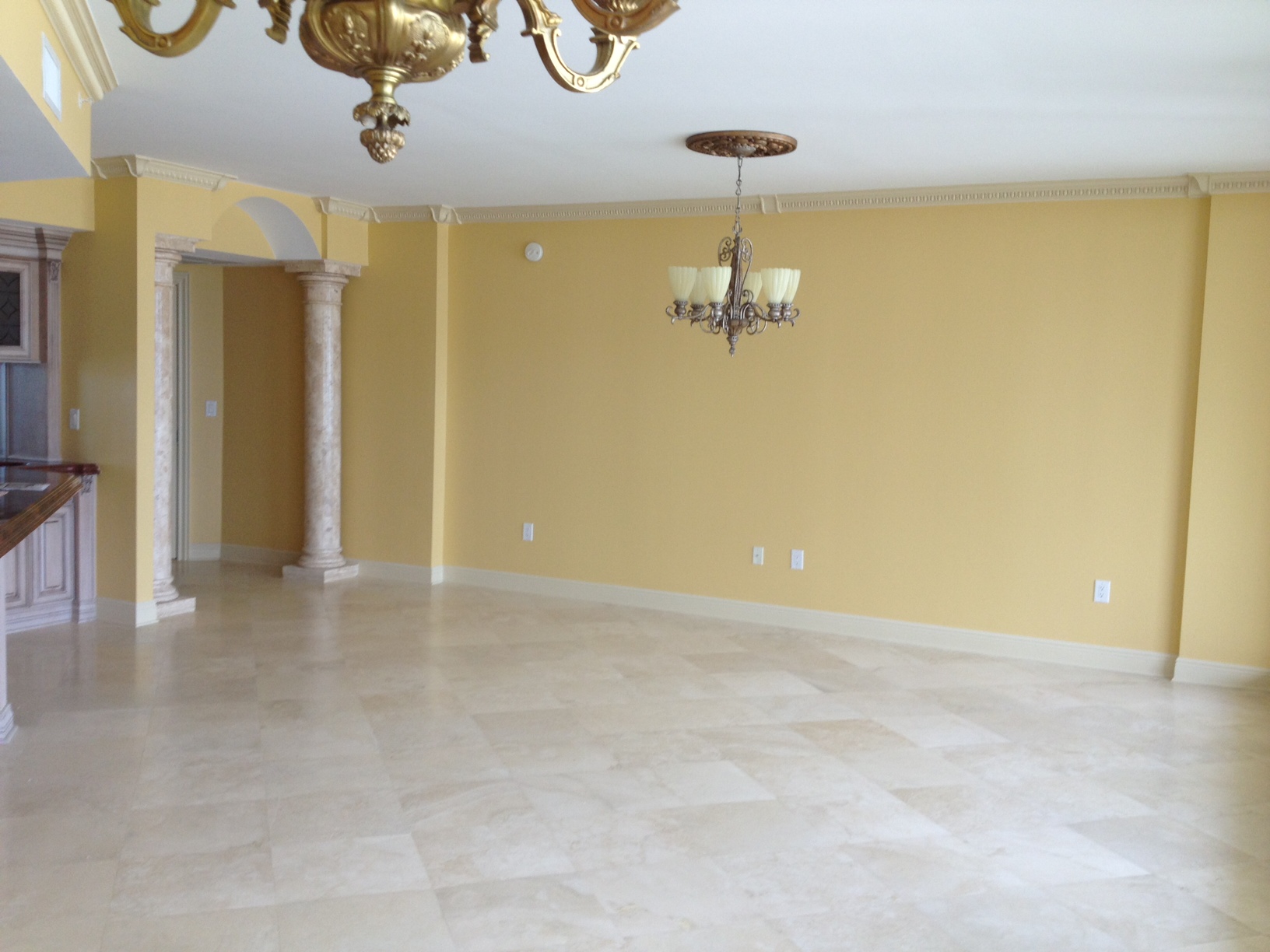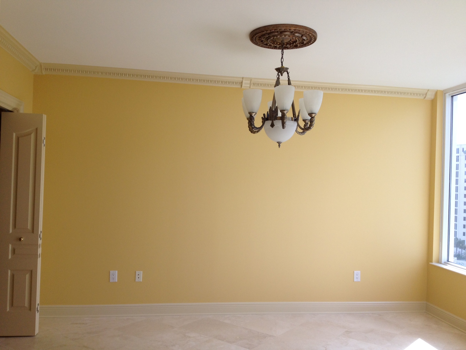 Below begins the photos I (tried to) take of the elevator vestibule. I am very proud of the change I was able to make to this room, yet was unable to capture it perfectly with my camera. I took the plain, boring walls of this private elevator entry and installed wood trim pieces to create waincot wall panels. I then installed a natural & pale yellow grasscloth to add color, and hung a gold shell light fixture by Currey and Company.