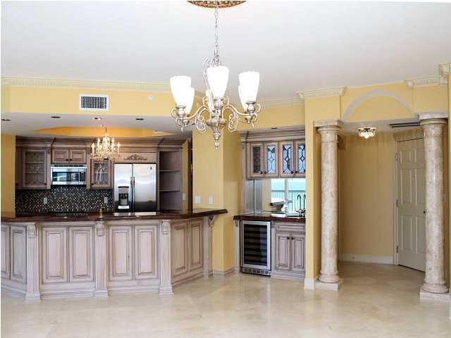 Kitchen: New counters, new paint, and some twinkling silver seafan pendants help to brighten the kitchen.