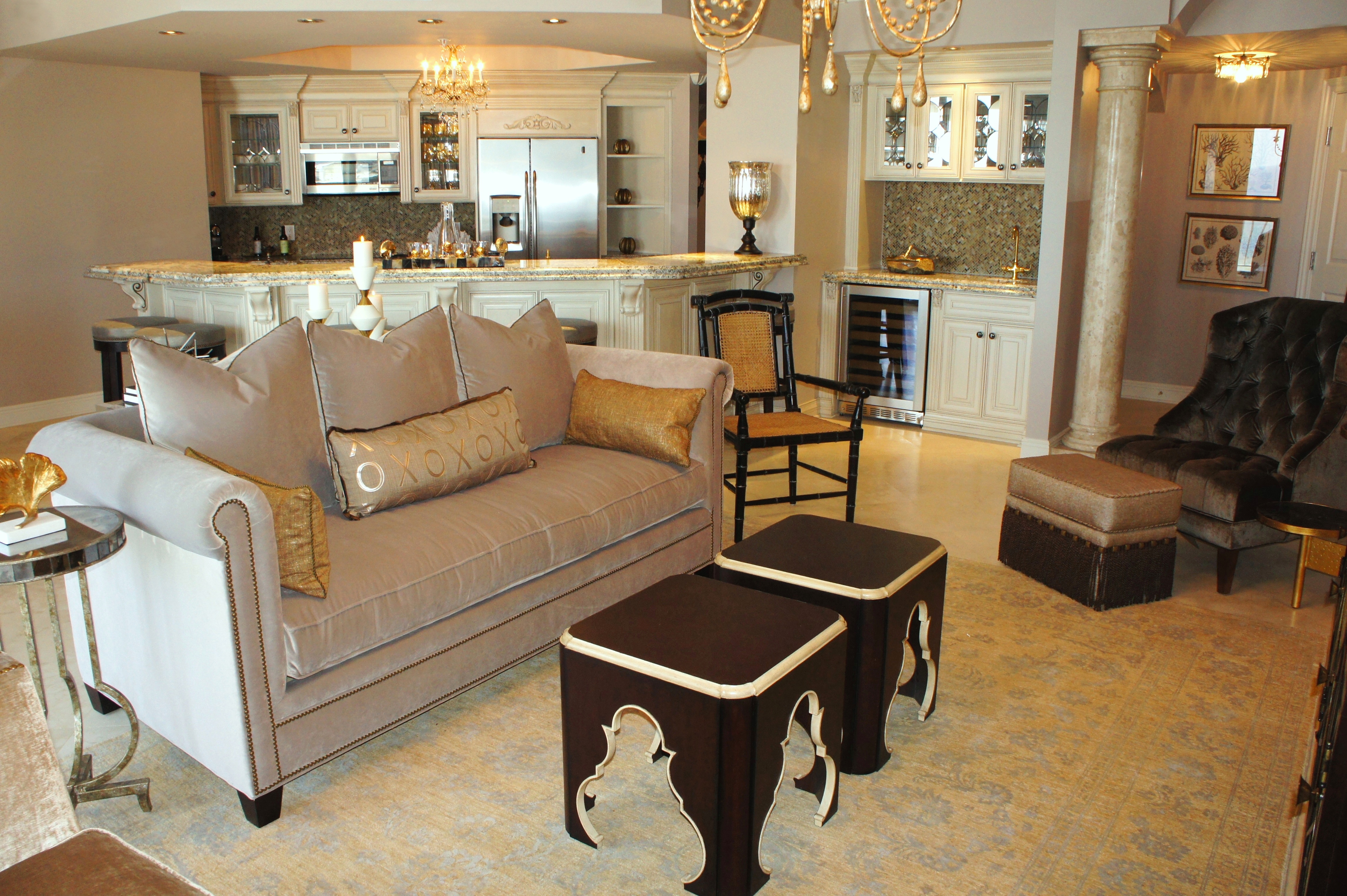 I also used cow hyde in the form of a large area rug under the dining table. The darkness of the hyde helps to anchor the dining space, while also differentiating the natural-colored table and chairs from the beige travertine floors. The kitchen cabinets, which were a generic wood color before, were made more contemporary simply by painting them the same color as the walls, and replacing the wrought iron leaf cabinet pulls with sleek, chrome pulls. The bar pendants were replaced by some antique mirror pendants by Worlds Away.