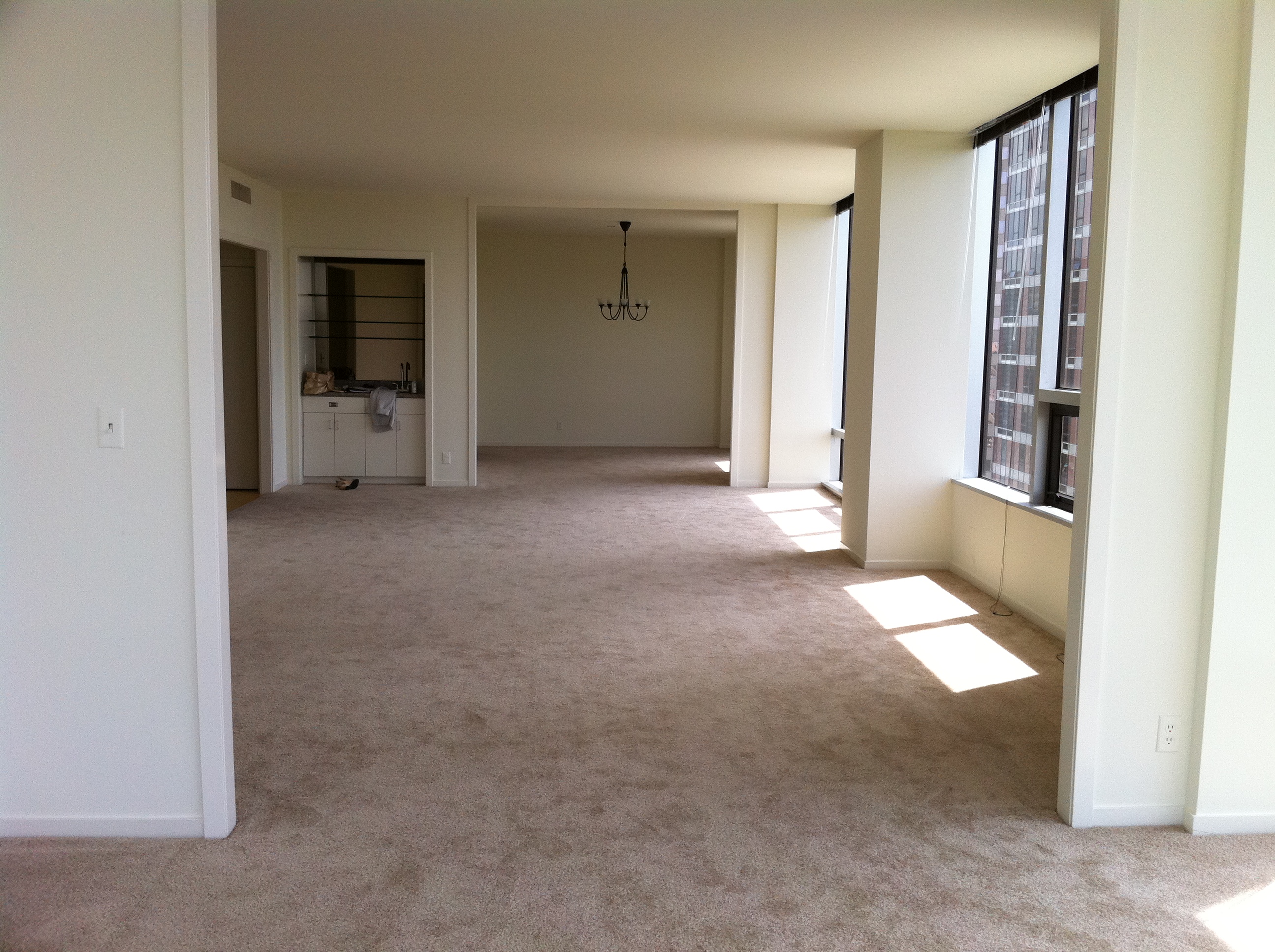You can see in this BEFORE photo, that the lighting occupying the expansive ceiling and 2-story space was rather small in scale and nondescript. I wanted to utilize the entire ceiling, while still only needing my one central electrical source (concrete ceilings in high rises always force me to be creative!). Here is what I did: