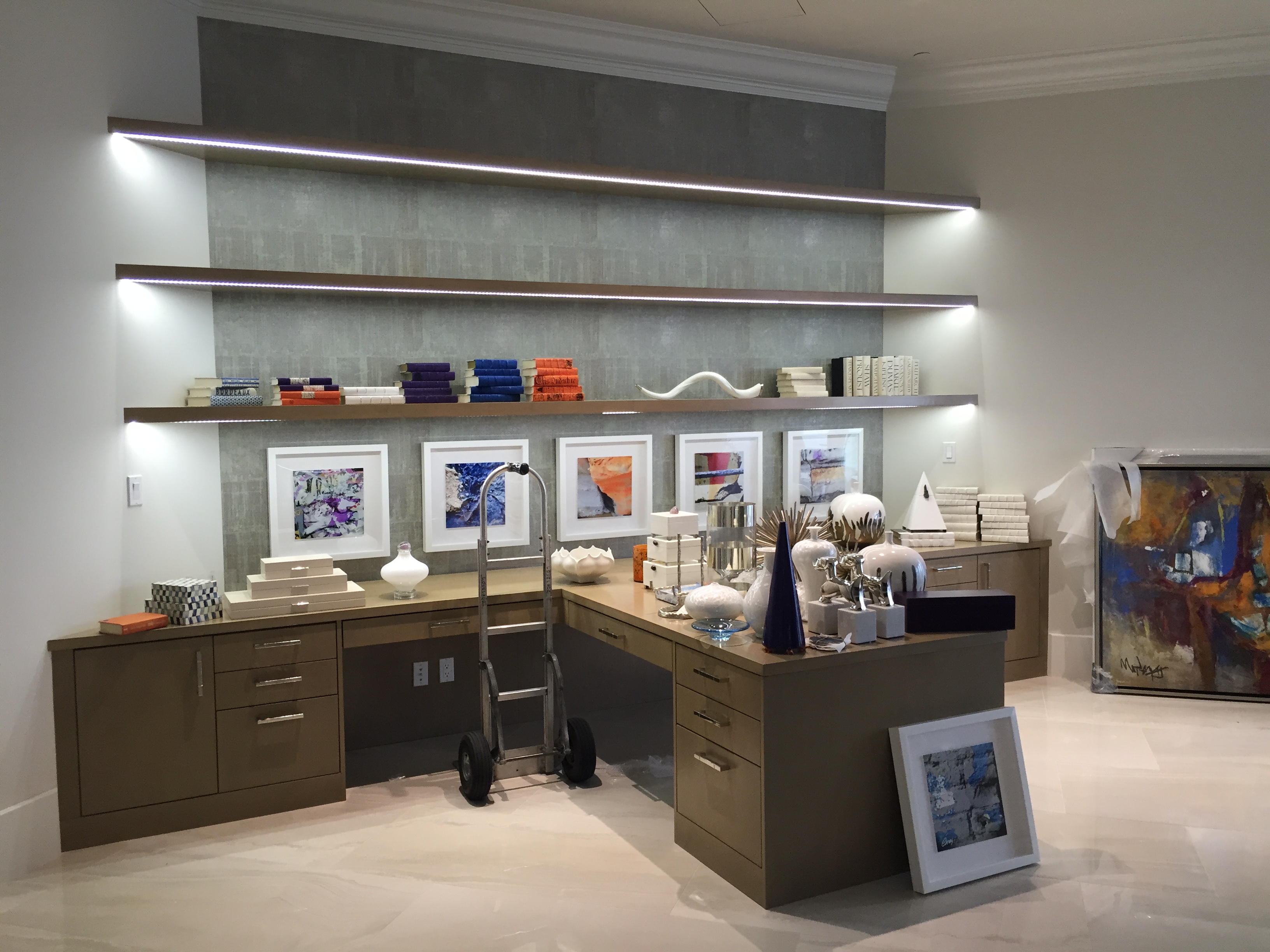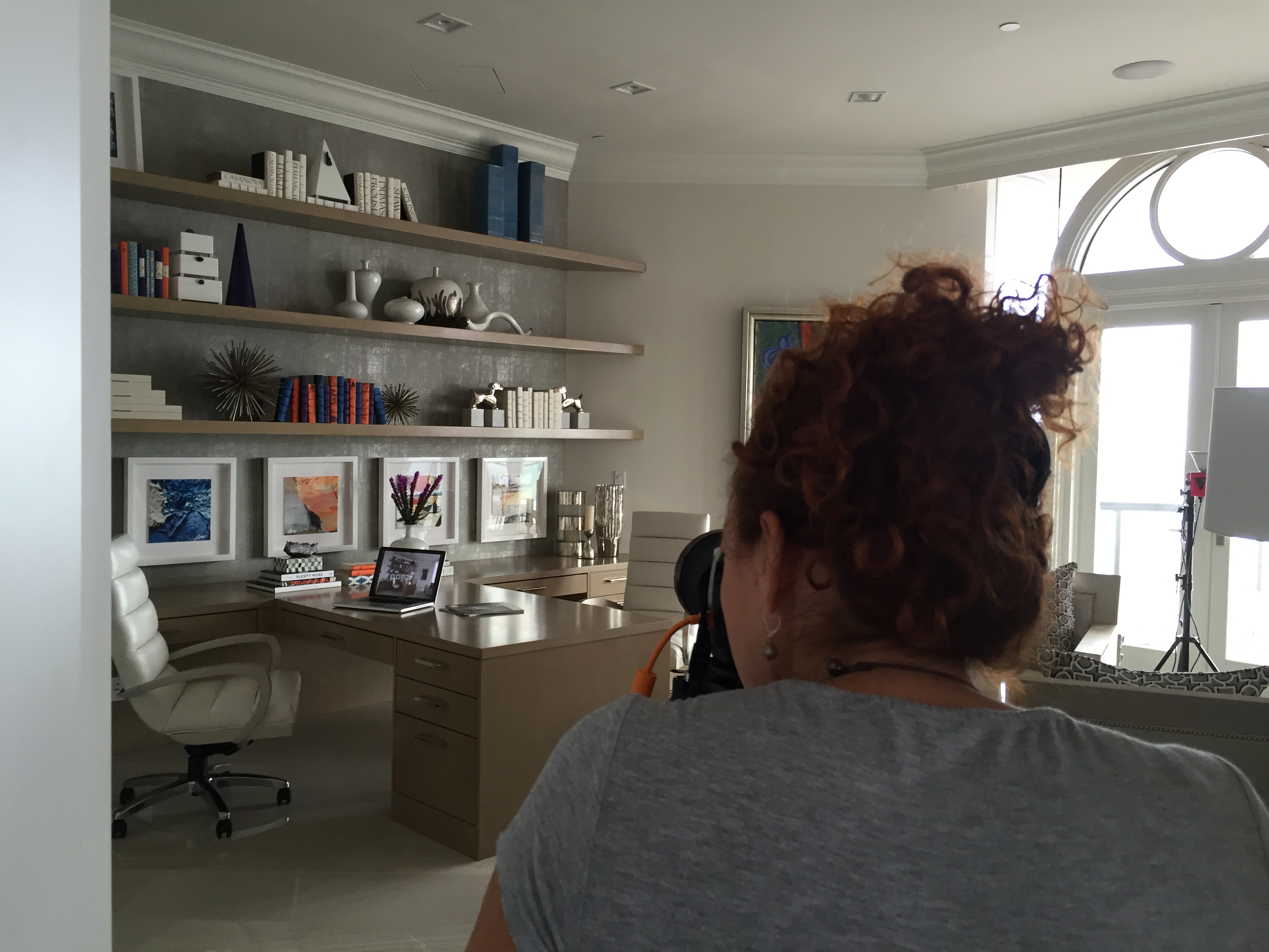 This is the Office. It has ample space for both clients to work, and I did my best to work magic on the display shelves! The office chairs are from Century furniture, and I covered them in a luxurious, soft cream leather, for maximum comfort.