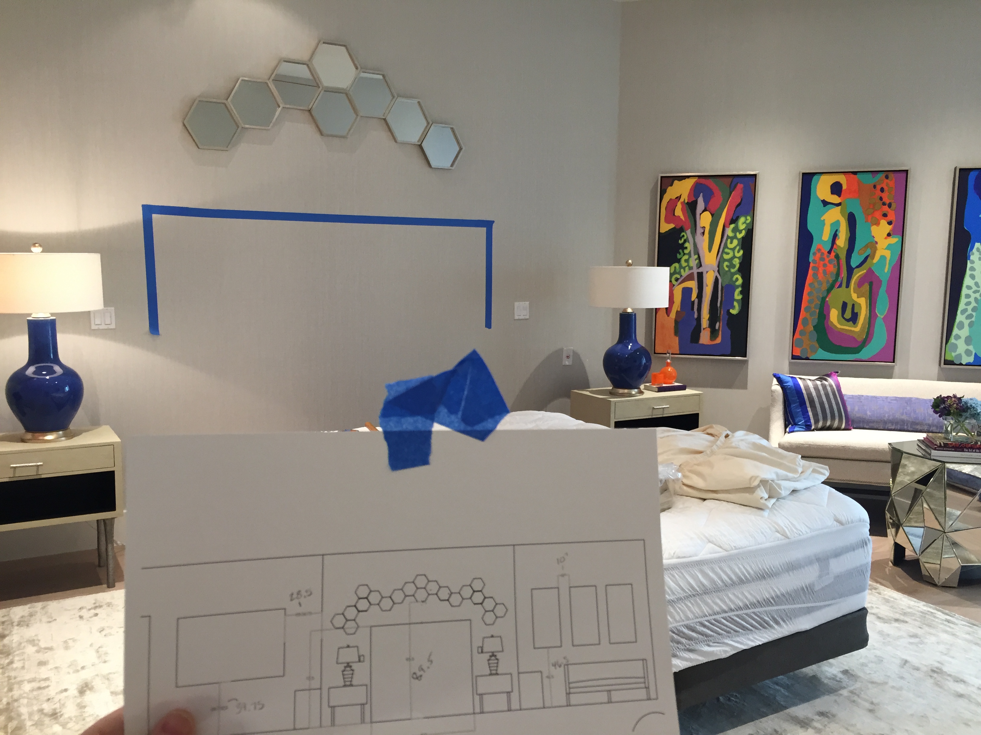 Laying out my plan for the Master bed wall, piece by piece. I’m sure the guys LOVE me and my ideas! They did a perfect job, though!