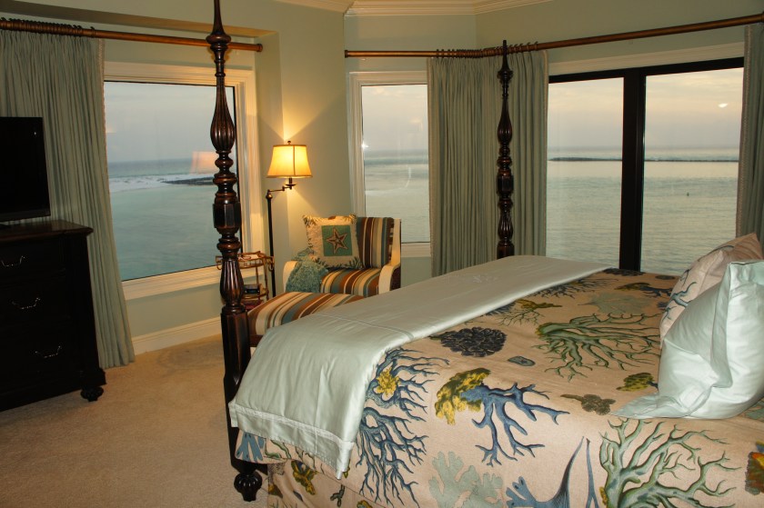 This is the second master bedroom.  It has a panoramic view of the harbor. Since the shutters were a great solution for treating the windows already, all the windows needed was some “makeup,” or non-functional drapes to dress it up a bit.  I used the same toile fabric that was in the bedding, and trimmed the valances in a glass bead.