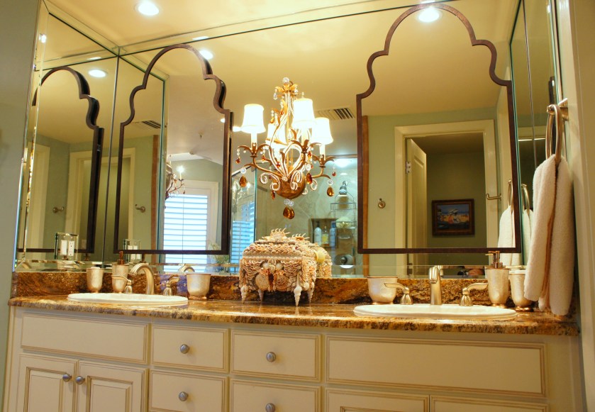 The Master Bathroom was less than impressive , with its globular lights and cabinets that blended into the granite.  We painted the cabinets to lighten the room up a bit. This helped to show off the beautiful granite.  I removed the globular lights, but decided to keep the wall-to-wall mirrors.  I, instead, dressed the wall by placing a mirror above each sink and installing a two-light sconce in the center.  The amber glass beads pulled out the colors in the granite and complemented the green color I painted the walls.
