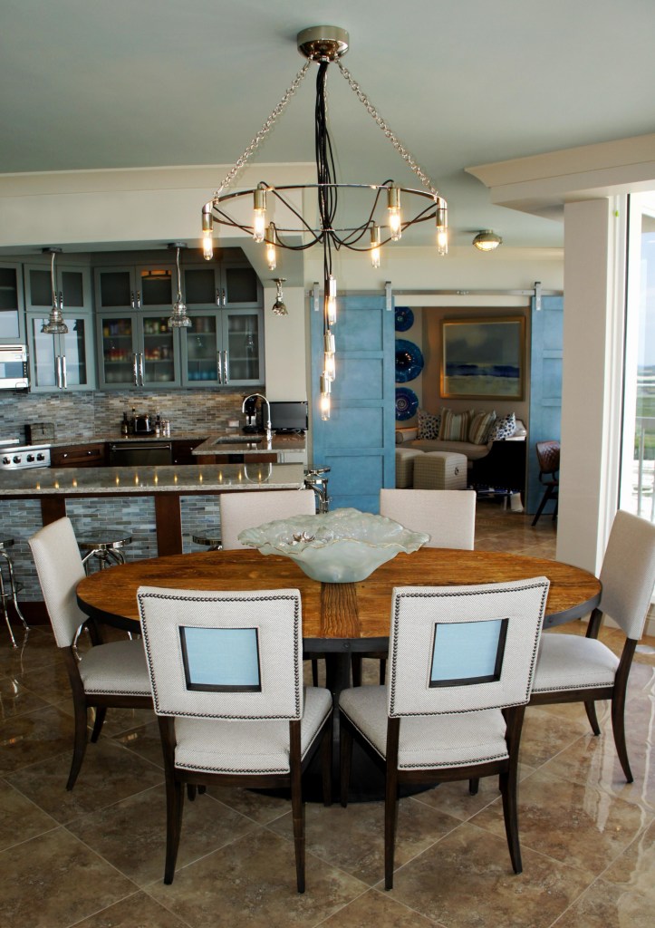 For the Dining Area, I opted for curvilinear lines to help break up the square seating arrangement I designed in the Living room.  My reclaimed wood oval dining table by Restoration Hardware was the perfect anchor for this area! The modern, industrial chandelier is by Arteriors Home, and the square-back chairs are by Vanguard Furniture.  I decided to play a little blue “peek-a-boo” with the backs of these chairs, to liven them up, and add some color to the area: