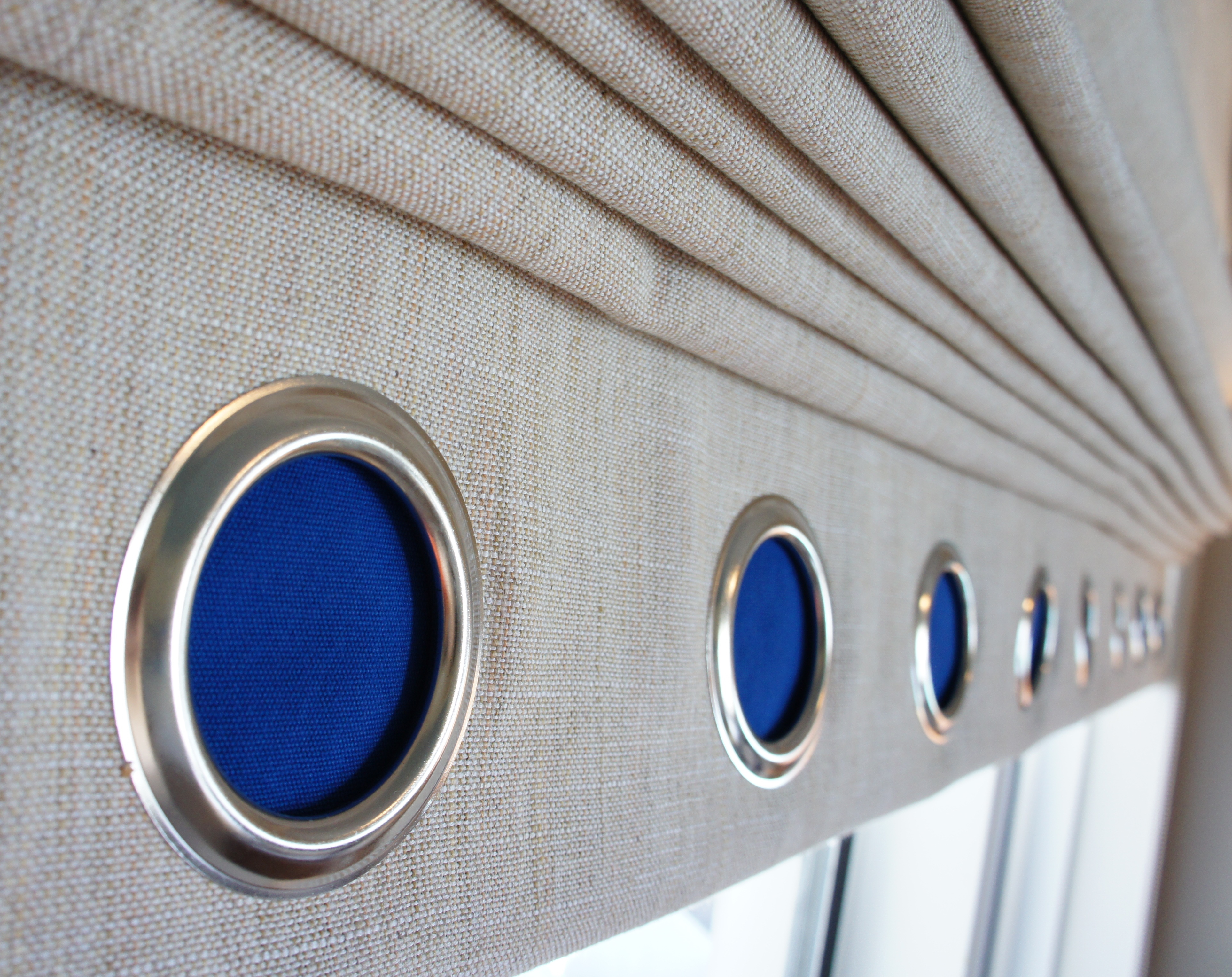 I wanted the large roman shades to remain mostly neutral, but I felt they needed some color and interest. Instead of doing a typical accent color band at the bottom, I chose to use nautical grommets on a reveal band at the bottom.  Behind the grommets, I designed a cobalt liner, which created the hint of color I wanted.
