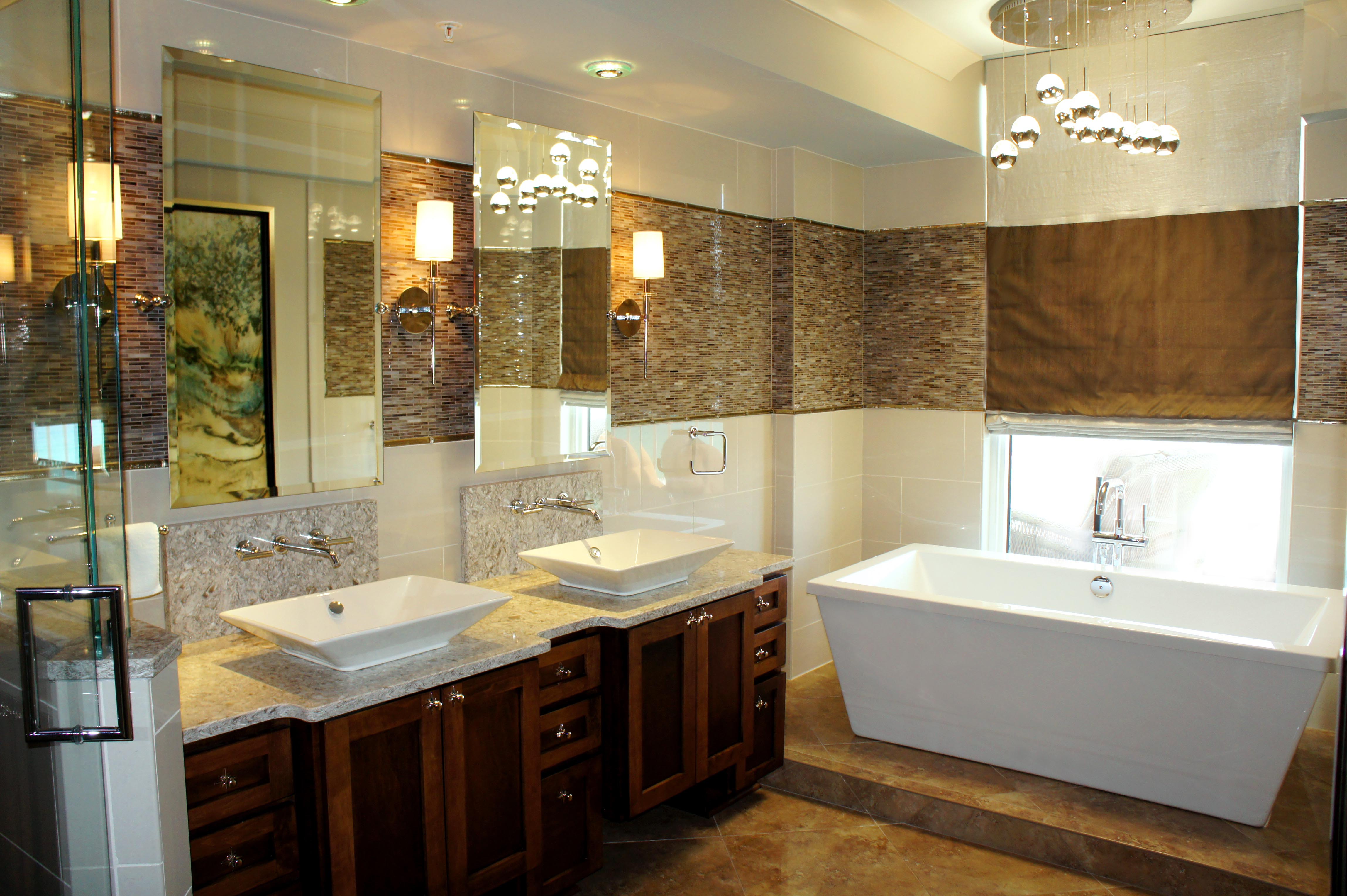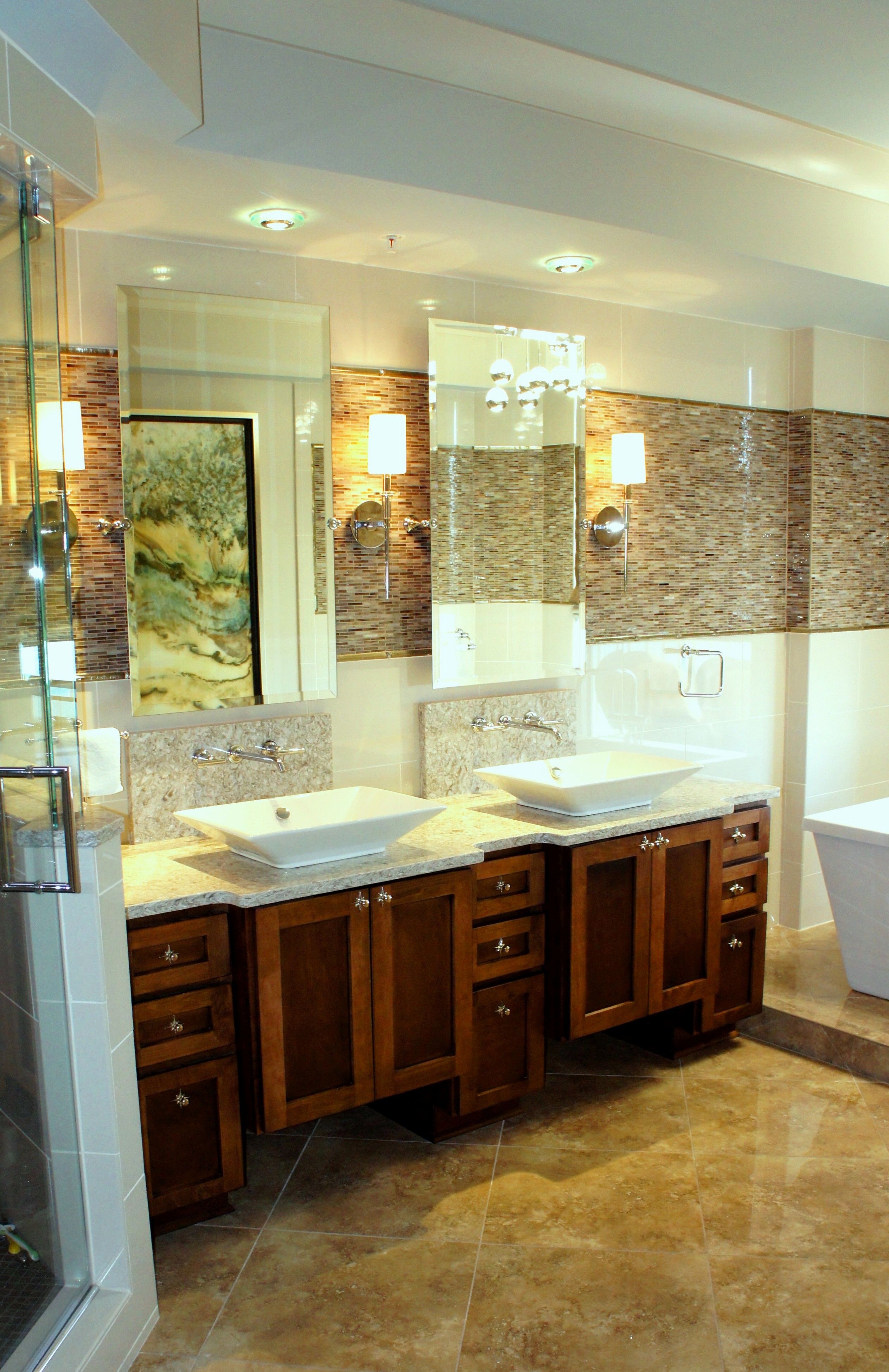 The Vanities consist of custom floating cabinets, shimmering glass "waterafalling" tiles, backlit mirrors, and a floating fireplace!