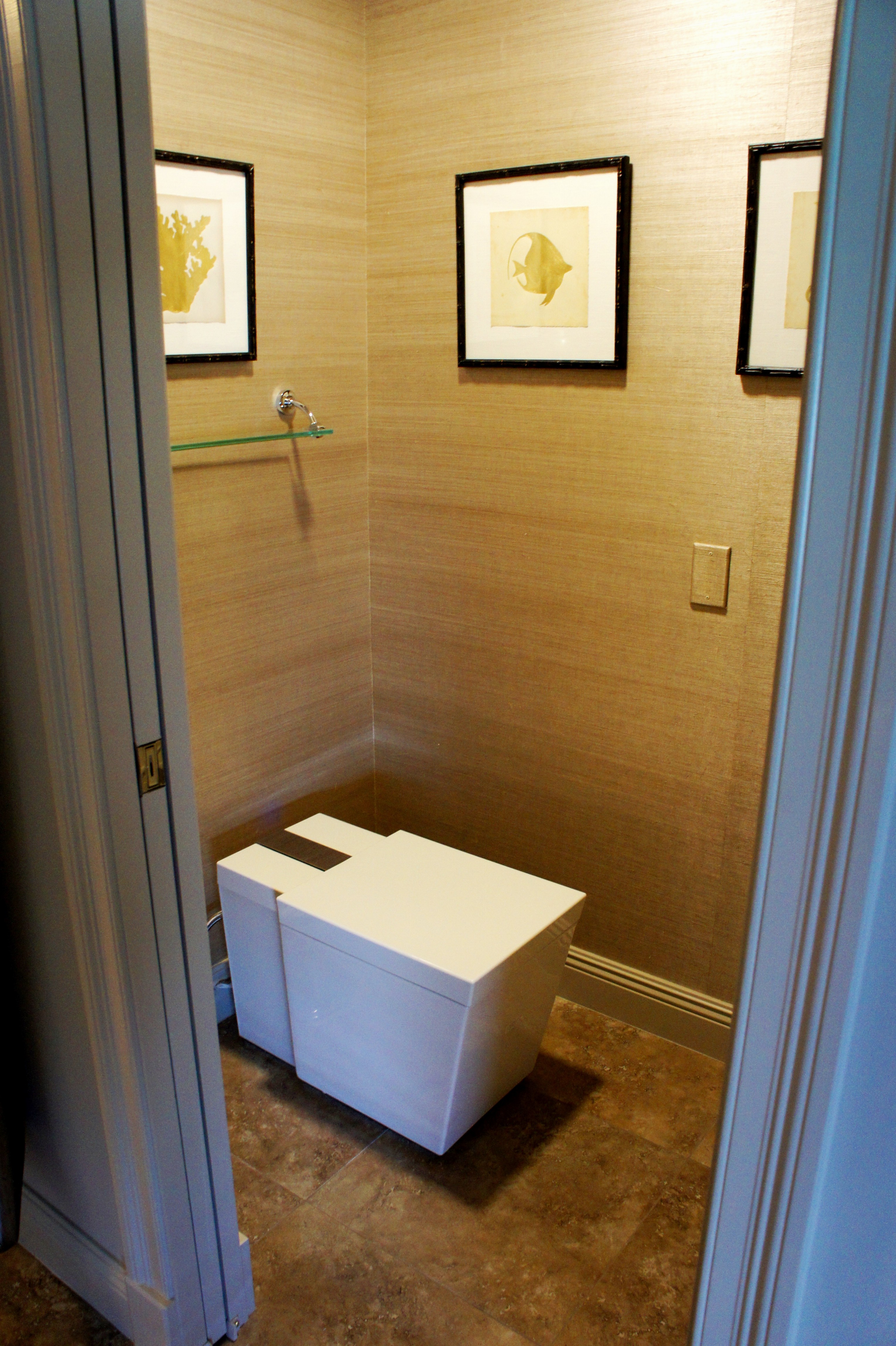 I covered the walls in a bamboo and grasscloth wallpaper for color and texture. To the right of the vanity, I hung two shell encrusted wall brackets with displayed corals. They were strategically placed to help mask the unavoidable seam in the wallcovering.